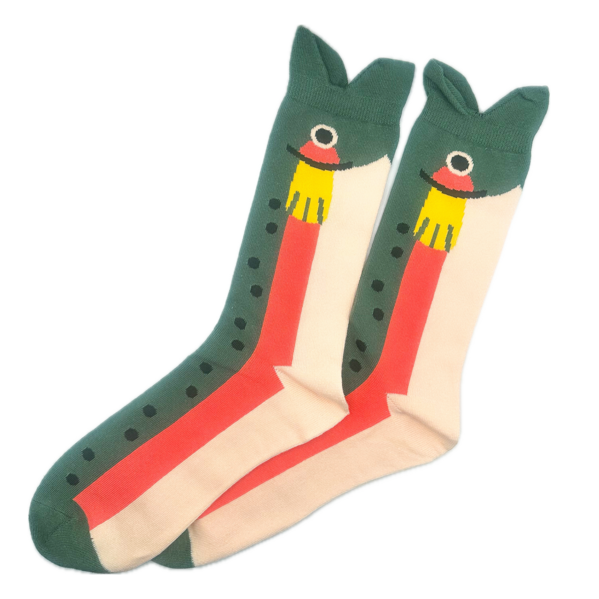 The ultimate fish lovers novelty sock, a trout eating your foot! Cotton blend socks with an altered edge for that charming trout mouth.